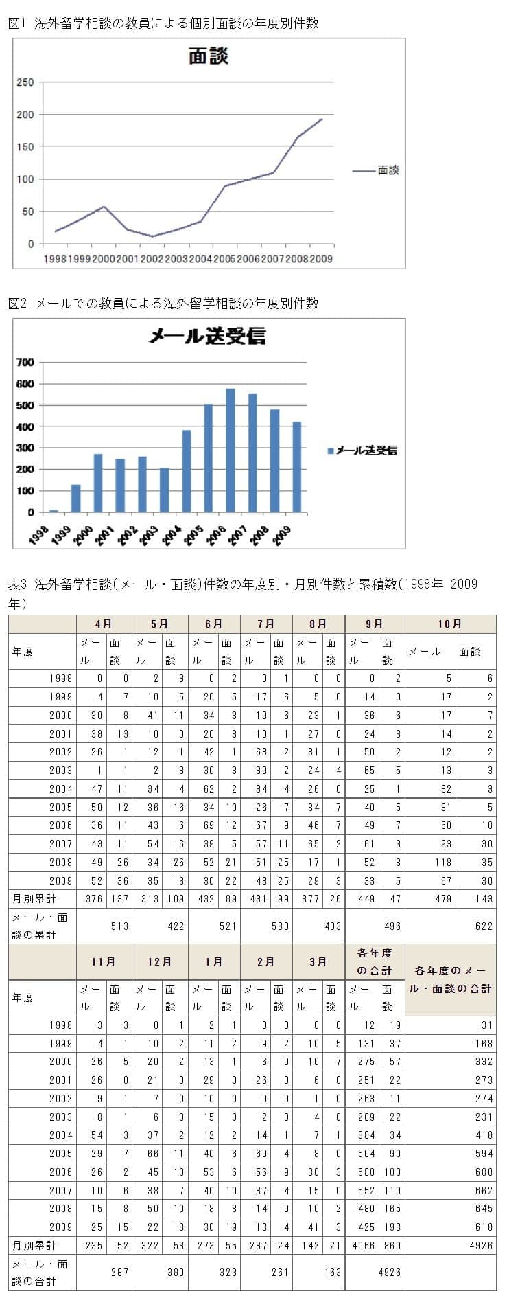 センターでは、留学 経験のある教員が、海外留学希望者や内定者の質問や相談をメールにて随時行っています。また留学中の海外の学生からもメールでの相談対応を必要に応じて 行っていり、留学先の大学のスタッフやコーディネーターや国際部学生交流推進課の担当職員と連携し、トラブル解決や勉学について適宜アドバイスやケアを 行っています。また、豊中と箕面キャンパスのセンター分室では毎週お昼休みに、また吹田キャンパスでは予約ベースで随時教員が個別面談による留学相談を 行っています。(図1・図2、表3を参照)また、国際部学生交流推進課の担当職員による留学派遣関係の留学前のメール相談や留学中のメール相談対応も急増 してきており、毎月送受信を合わせると延べ200件以上に及んできています。