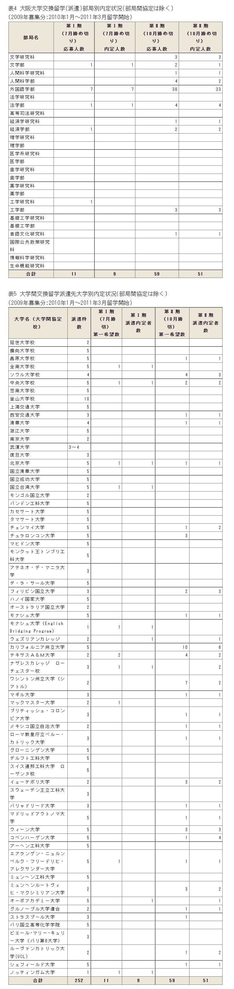 前述のように、約300名の留学オリエンテーション参加者があり、また日々の留学相談の件数もかなりの数になってきていることから多くの学生が海外留学に興味を示していることが伺えます。それにともなって、大学間交換留学派遣者数も増大してきているとはいえ、提携大学が受け入れに際し要求する語学能力水準などの条件をクリアし、学内面接選考をパスし、実際に交換留学を実現した学生数は、増えてきているとはいえ、平成21年度においても、大学間交換に限定すれば、なお60名にとどまっています。(表4・表5を参照)その他、部局間協定での交換留学や休学しての海外留学を入れると1学期間以上の留学者数は数百名に増加してきている。しかしながら、全学生に占める海外留学者数は、なお極めて少ない。在学中の長期留学の障壁となっている、様々な要因を特定して、派遣留学者数を伸ばしていくことが引き続き課題となっていると言えます。